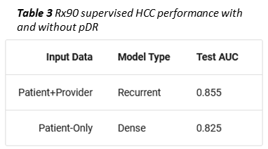 As an example, we trained a second, supervised member-level model to predict whether a given member would become a high cost claimant, i.e. exceed $100k in total allowed amount, in the coming year. To simulate a limited data scenario, members were represented with only 90 days of Rx data (Prybol and Dwyer 2020)*. Under these conditions, concatenating a provider vector (obtained using an RNN to collapse all of a member’s pDRs into one vector) to the mDR improved high cost claimant prediction by ten percent (Table 3).