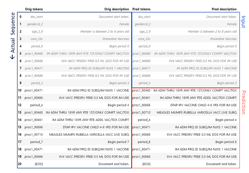 Figure 3 CORE® GPT Clinical Pathways output. The actual sequence of utilization of preventive services for a female age 2-9 is given in the left hand column, spanning two years. The first ten procedures or “tokens” of this sequence (right column, blue) were fed to the CORE® GPT Clinical Pathways model, which predicted the next ten tokens (right column, red).