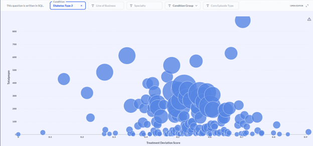 In the example population shown in Figure 4, investigation of the endocrinologist represented by the upper-right-most bubble yielded clinical verification of his outlier status. He was prescribing GLP-1 inhibitors at a much higher rate than his peers—and at nearly twice the unit cost!