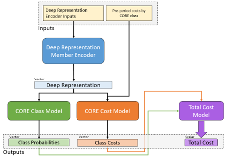Figure 5 Architecture diagram of a portion of the All-CORE® model. Member histories are represented as documents and subject to a deep learning encoder, which yields a latent layer that can be used as a new mDR. This layer is fed in turn into a model branch predicting class probabilities for new diagnosis of every CORE® condition (green) as well as a model branch predicting the log-transformed future cost for every condition. The resulting predictions are fed forward again into a total cost model at the member level, so the entire network can be optimized at once.